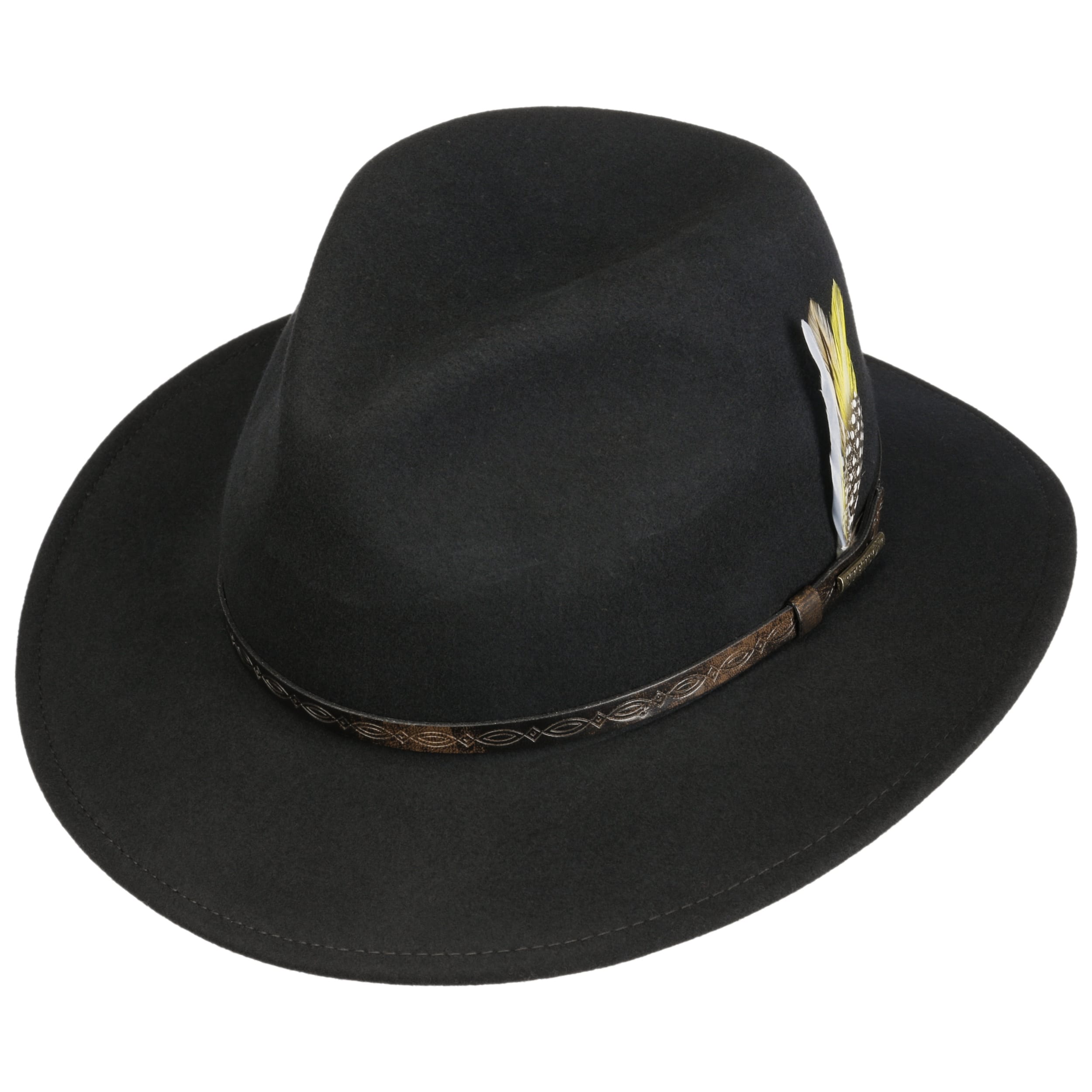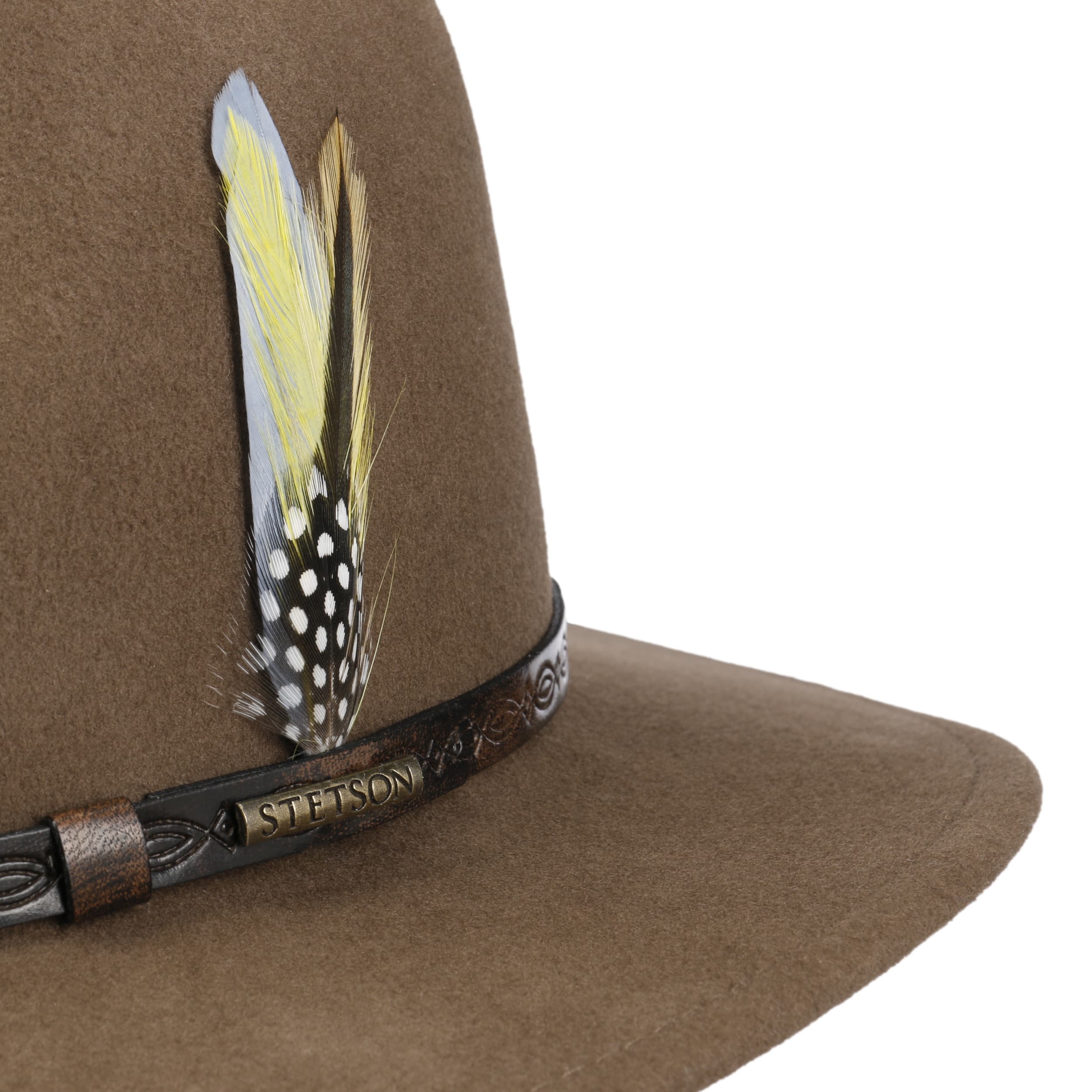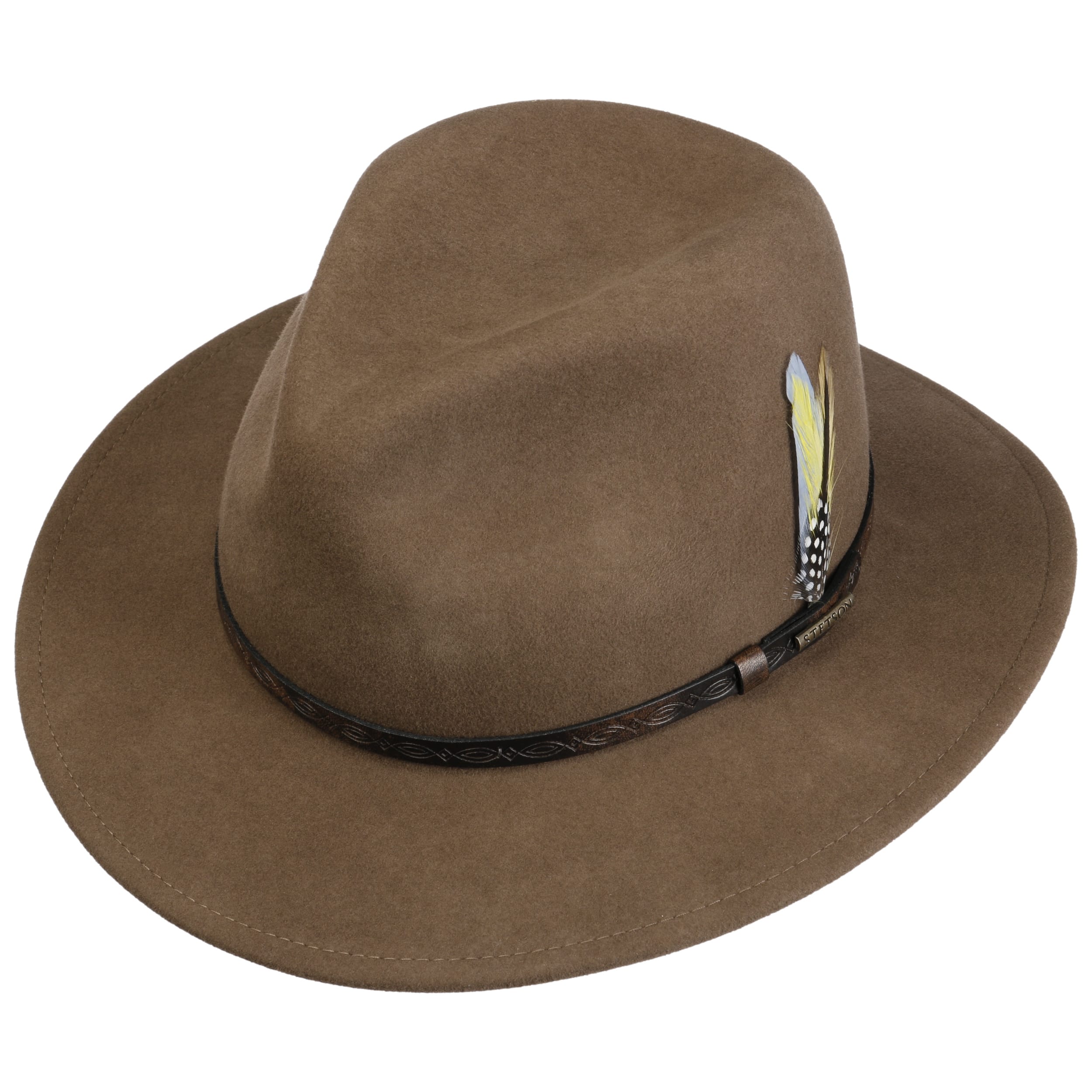 A traveller hat in authentic shape in brand quality with cult status: It is a Stetson creation made from virgin wool, processed into soft felt. The plain-coloured felt hat with water-repellent properties has been designed to withstand damp weather and rain showers and can be crumpled up or folded without compromising on beauty and quality. Meanwhile, a vintage-style leather trim band with feather ornaments and a metal brand emblem emphasises the sense of style.