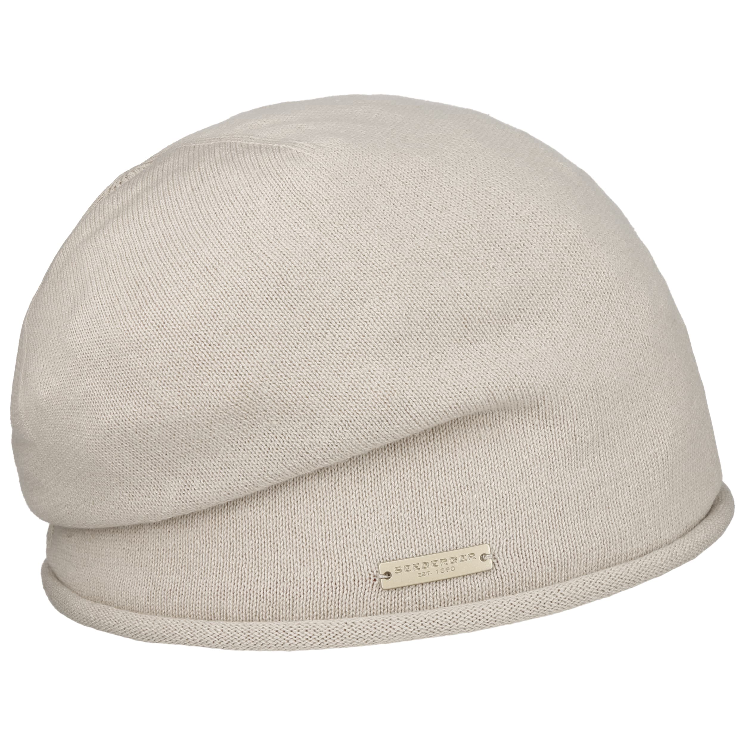 If you want to wear a hat even in the summer, it will be this plain-coloured beanie from Seeberger which is made of a very lightweight cotton knit that drapes over the head. The hat with an oversized shape casually drapes over the back of the head, while it also nestles against the forehead and ears with its stylish rolled brim.