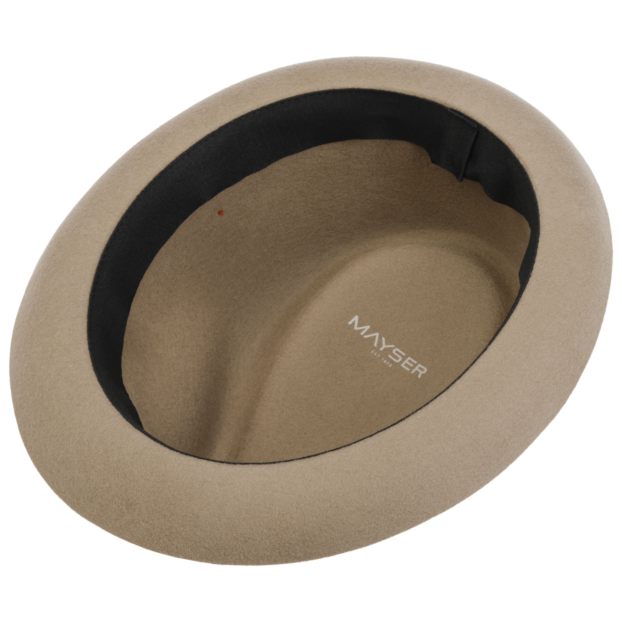 Wool gives the player hat, processed into felt, a warm touch and a supple, soft feel that emphasises its neat appearance. The brim of the felt hat from Mayser stands out with skilful charm to give it a cheeky chic look, with which the colourful striped grosgrain ribbon trim band and a brand pin on the side harmonise perfectly.