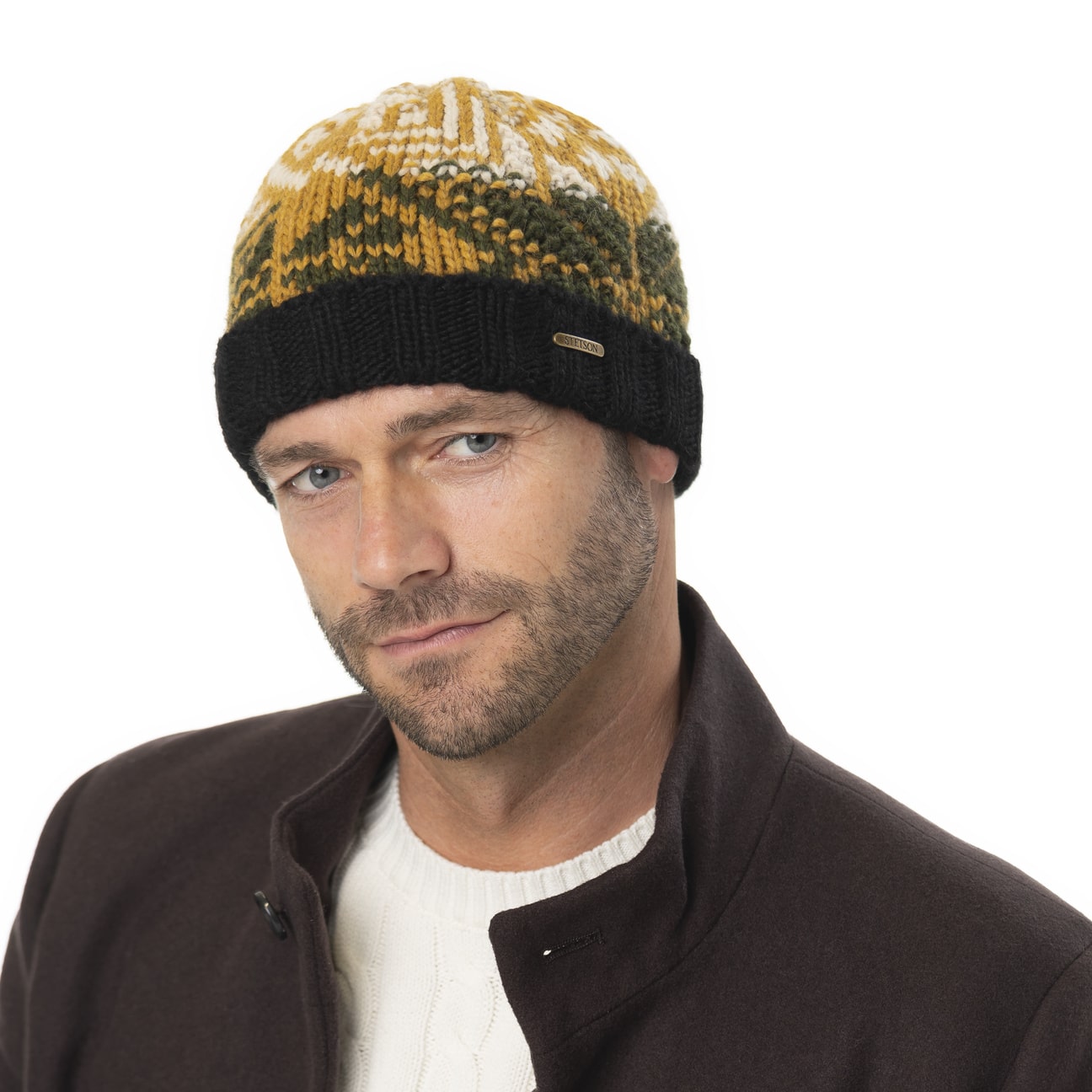 With the Italian-made beanie hat from Stetson, which is made from alpaca wool, pure wool and viscose, among other materials, you are choosing a companion that is temperature-regulating, wind-repellent and breathable, and is also extremely comfortable to wear. In addition to its turn-up, the knitted hat scores points with its colours and creative patterns, successfully defying the grey skies.