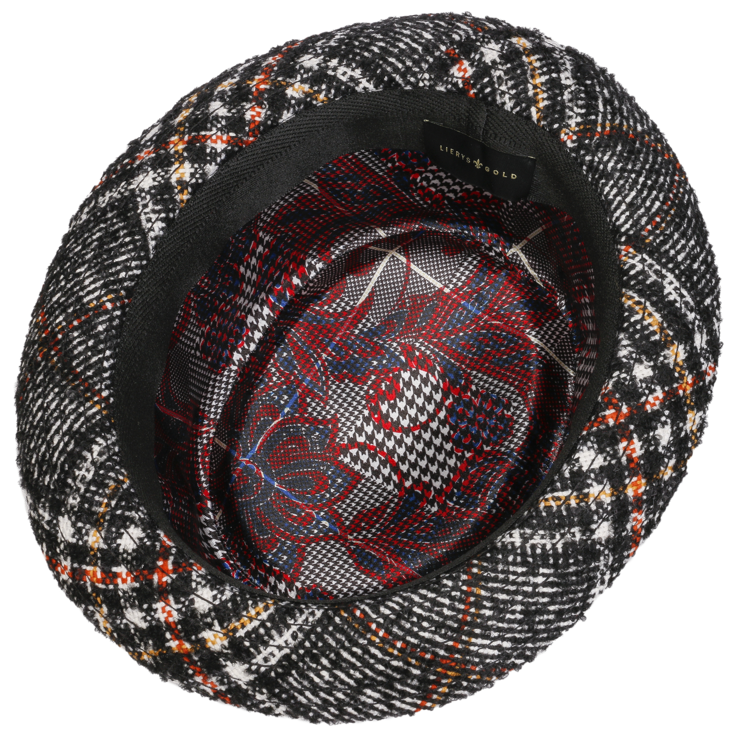 With its eye-catching design and charming details, the chic pork pie by Lierys Gold attracts attention. Its material with a high percentage of new wool and alpaca wool features a vibrant pattern of checks and overchecks. Different fluctuations in the pattern and strong contrasting colours create a truly vivid look. A shiny grosgrain ribbon with bow and metal emblem elegantly complete the look.