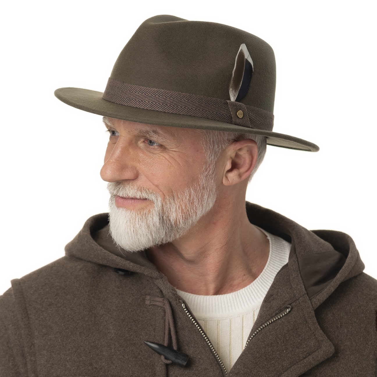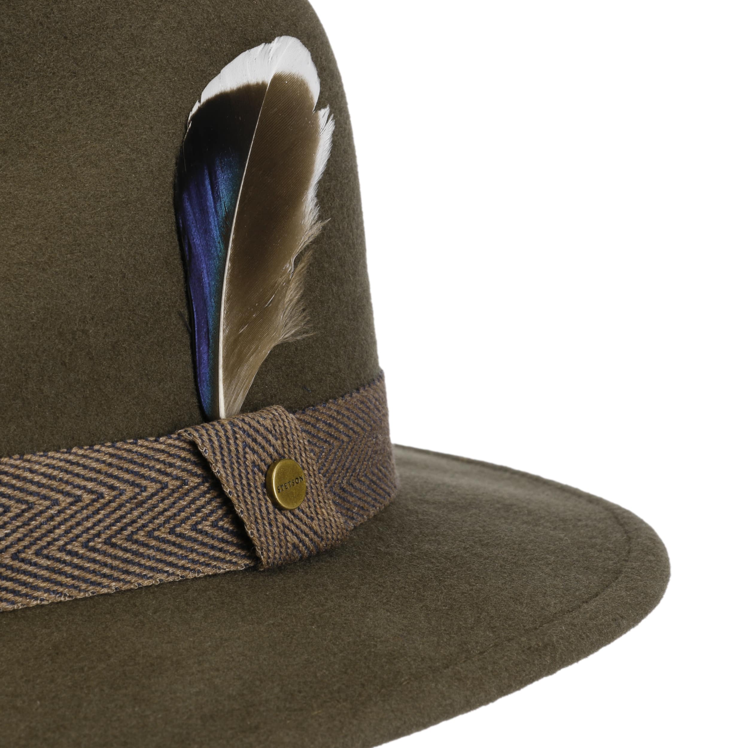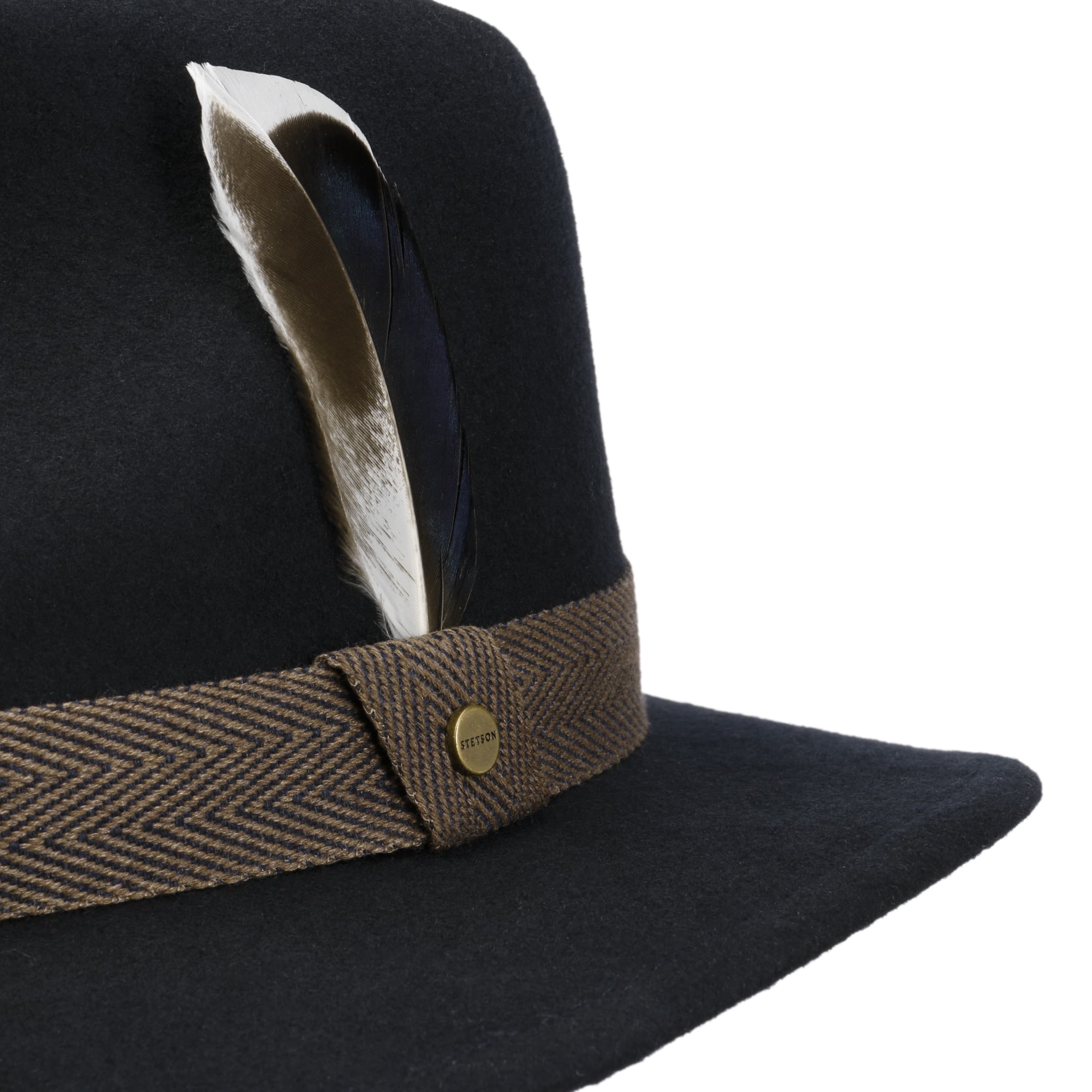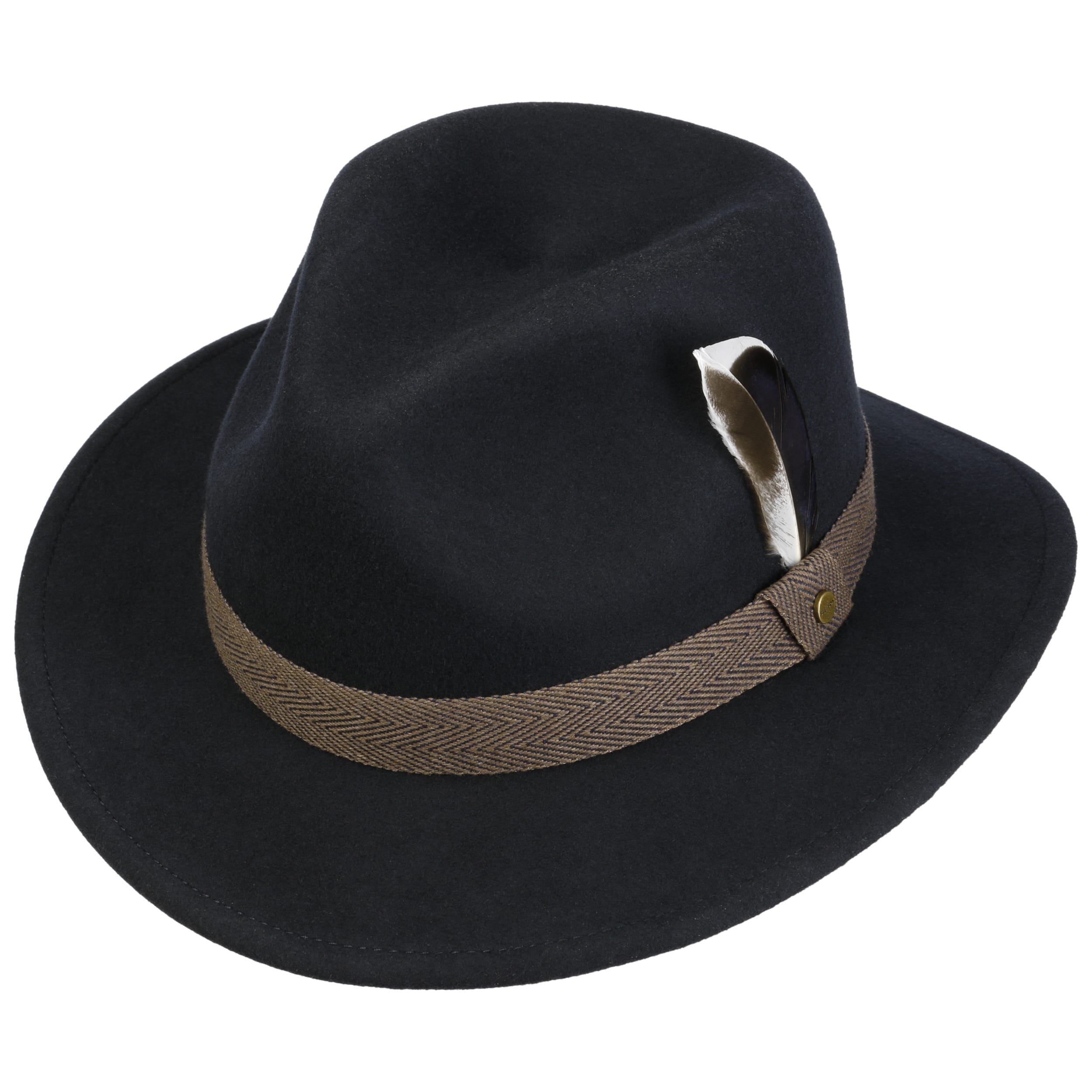 The traveller hat from the Stetson brand presents itself beautifully with its dented crown. High-quality wool from Australian sheep was obtained for the production and carefully processed into felt, which has water-repellent properties for outdoor use. The stylish plain-coloured appearance is complemented by a herringbone pattern trim band with an attractive crossbar and finished off with a smart feather trim on the side: a fashionable and elegant finishing touch to your outfit.