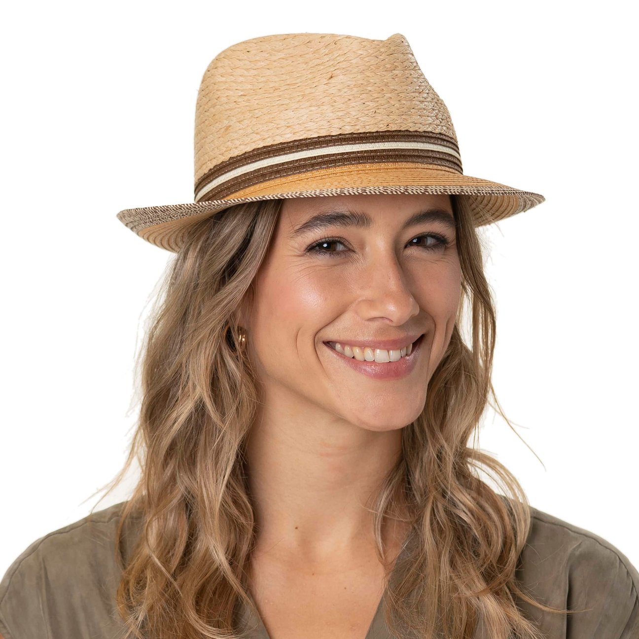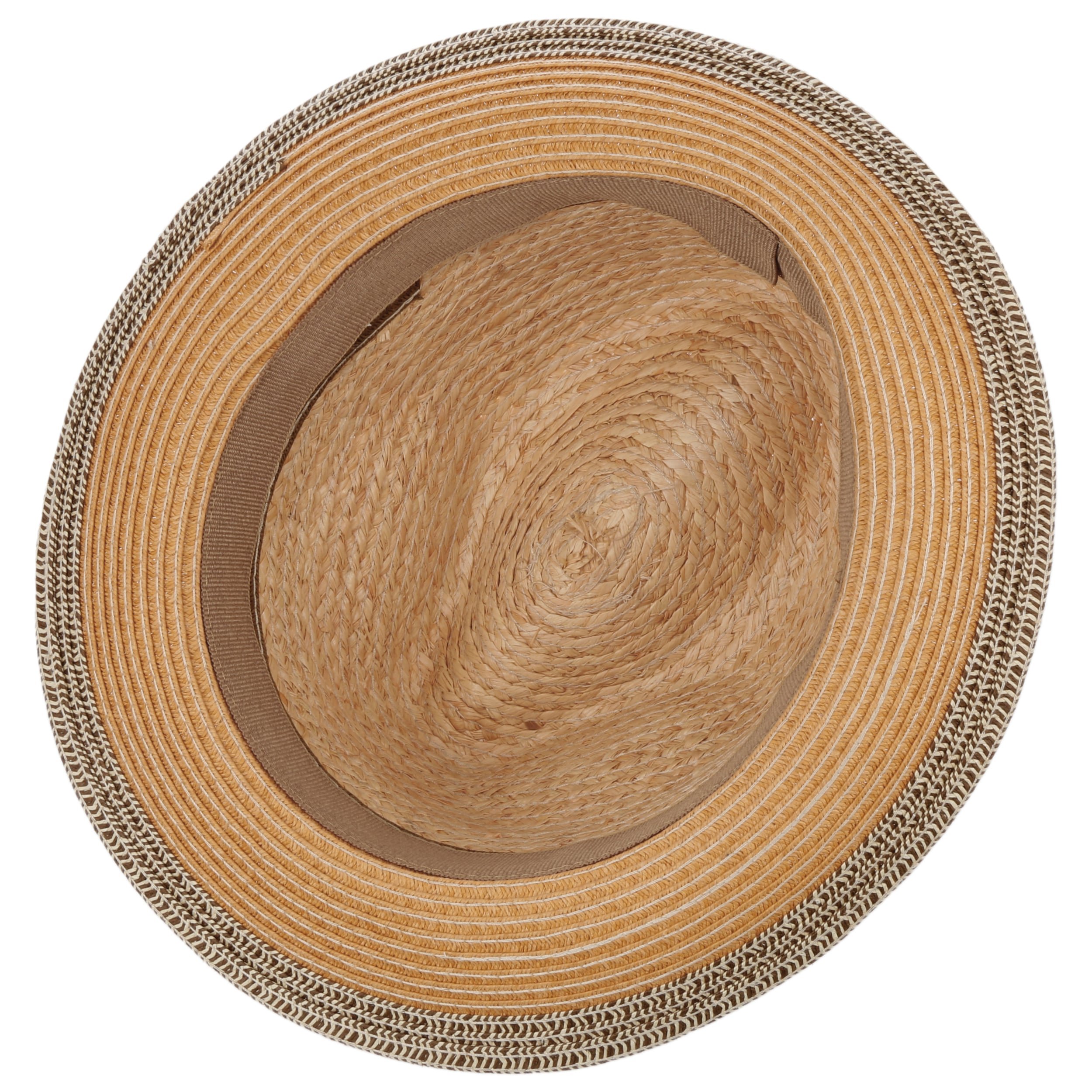 This is how colourful and fashionable a straw hat can look. Subtly patterned in natural shades, the wide-brimmed fedora adds a touch of Italian style to European pedestrian areas. The summer hat owes its high quality appearance to the use of lightweight yet robust raffia and paper straw. A comfortable source of shade that looks perfect with a lightweight linen suit or cotton jacket.