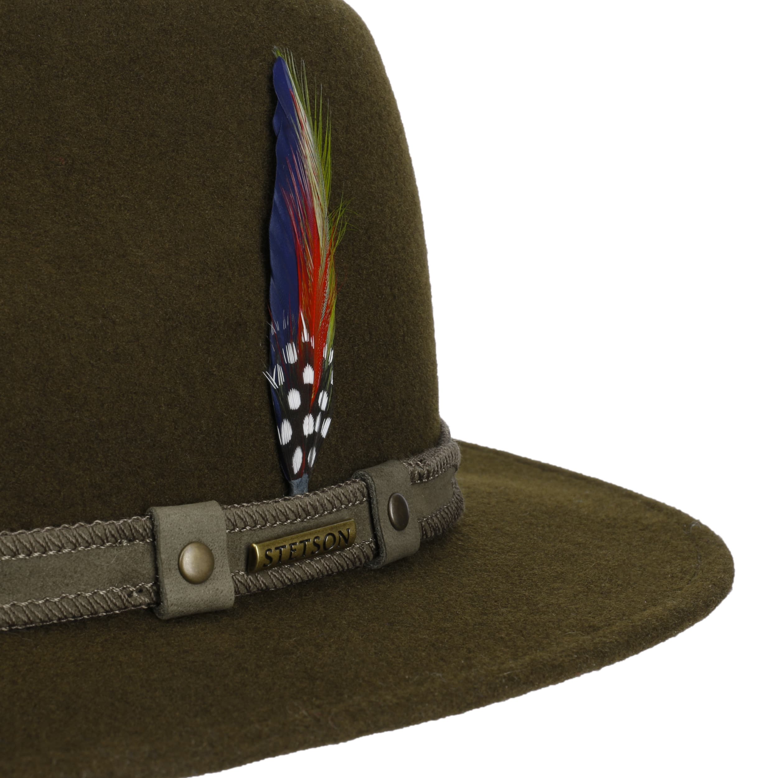 The Stetson traveller hat is unobtrusively stately and brings quality to the head with its high-quality, mulesing-free wool felt. The handmade felt hat sits comfortably with its crushable properties and supple feel and looks good on both ladies and gentlemen in a plain-coloured appearance, with an ornate leather trim band and feather decoration on the side. Meanwhile, water-repellent properties give the hat real outdoor qualities.
