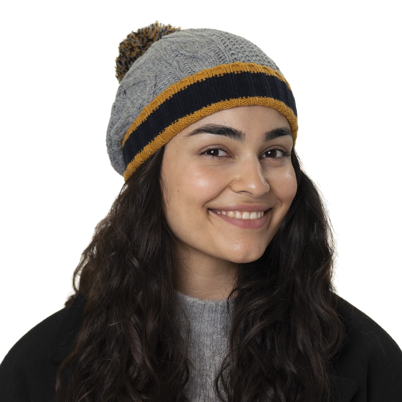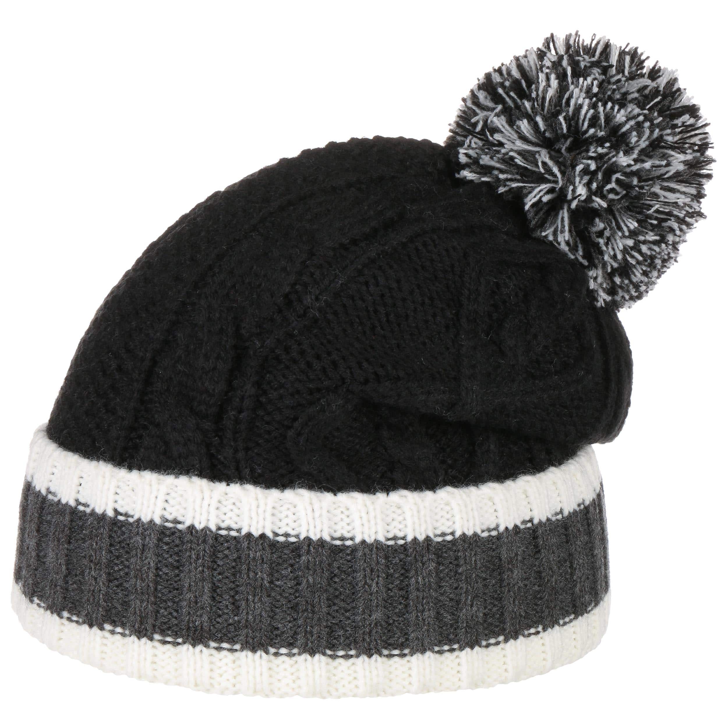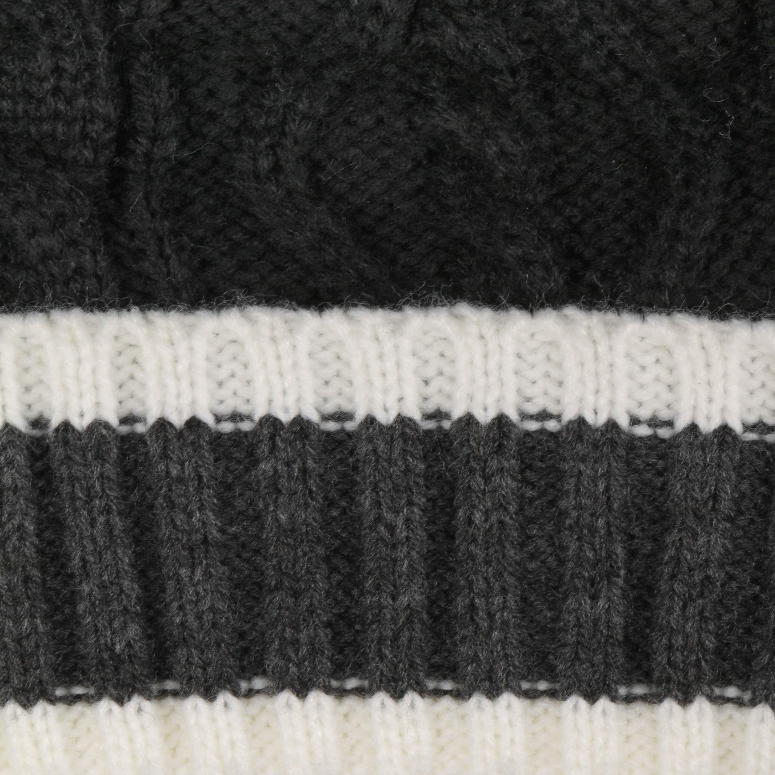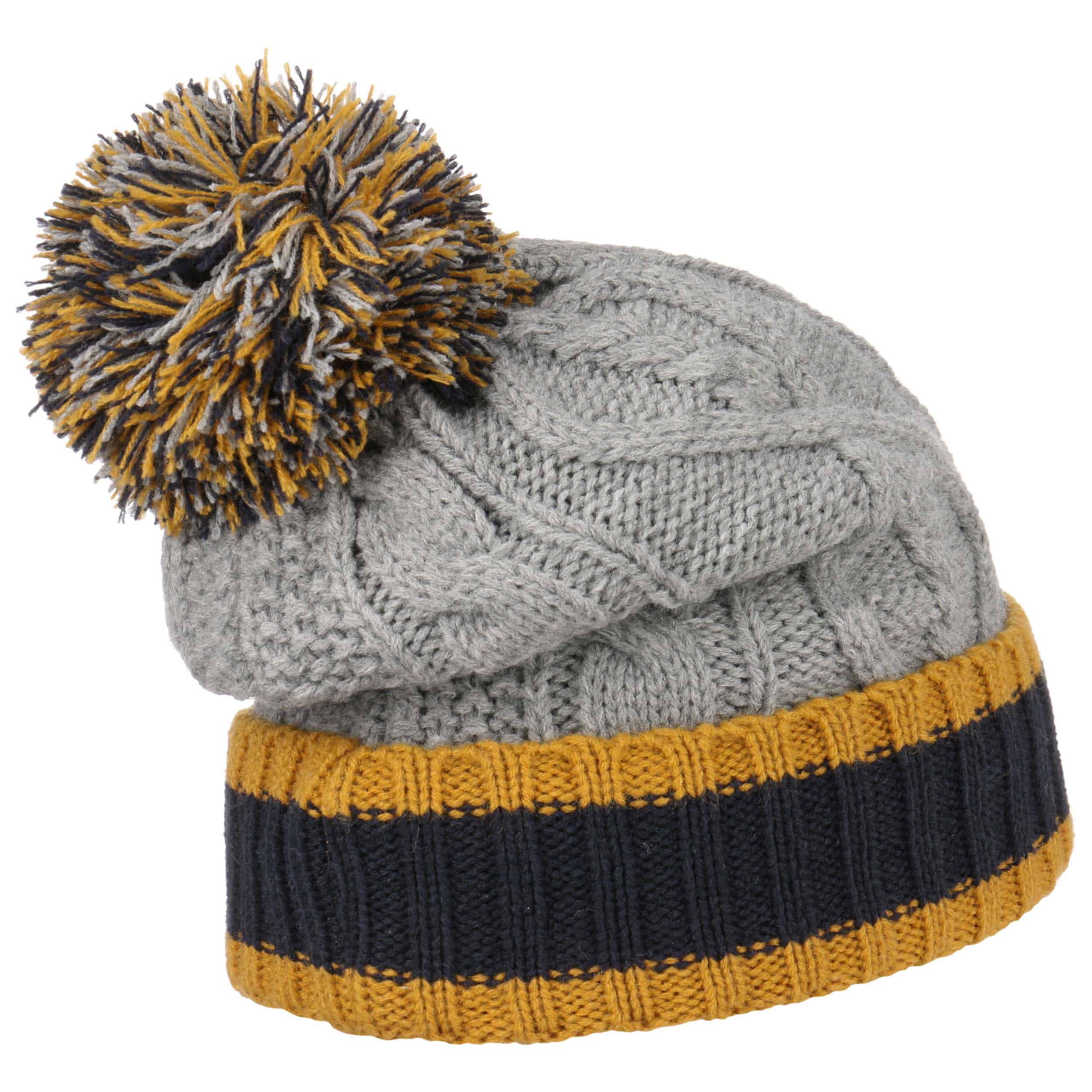 Inside, the Lipodo beanie has a heat-insulating fleece lining which nestles protectively against the head right down over the ears. Above the trendy striped turn-up brim in a rib knit, the pompom hat continues on in a fashionable plain-coloured cable pattern and ends in a pompom made up of all the colours combined. This makes the winter hat the cosy high point of any outfit and versatile to combine with outfits.