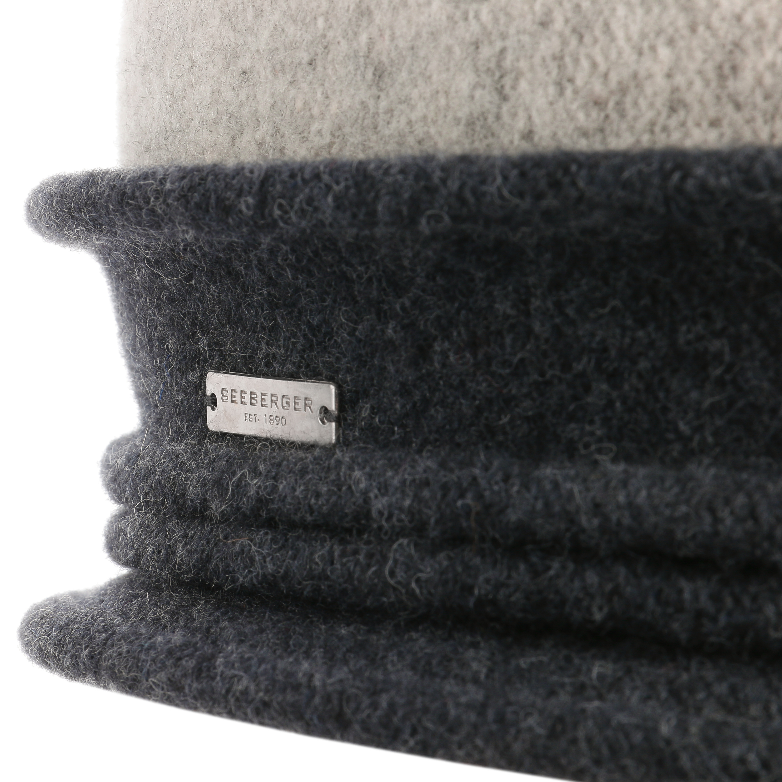 A special feature of this stylish ladies hat from Seeberger is its contrasting turn-up brim. Laid out in folds like a wide band, it encircles the emphatically rounded crown. Colours differentiate the sections from one another. The pleasantly soft knitted material that makes up the modern felt hat is made of 100% new wool - comfortable, warming and visually appealing.