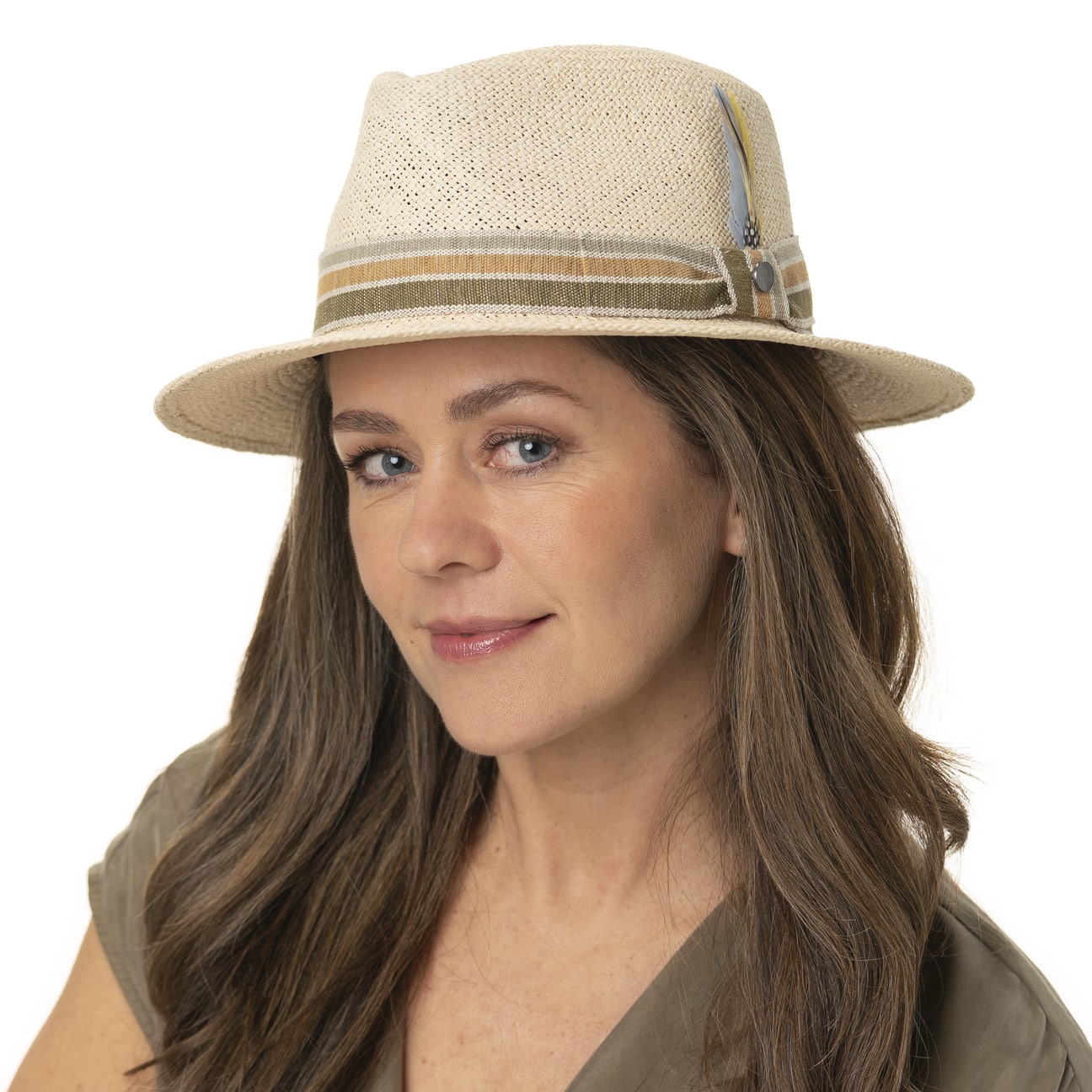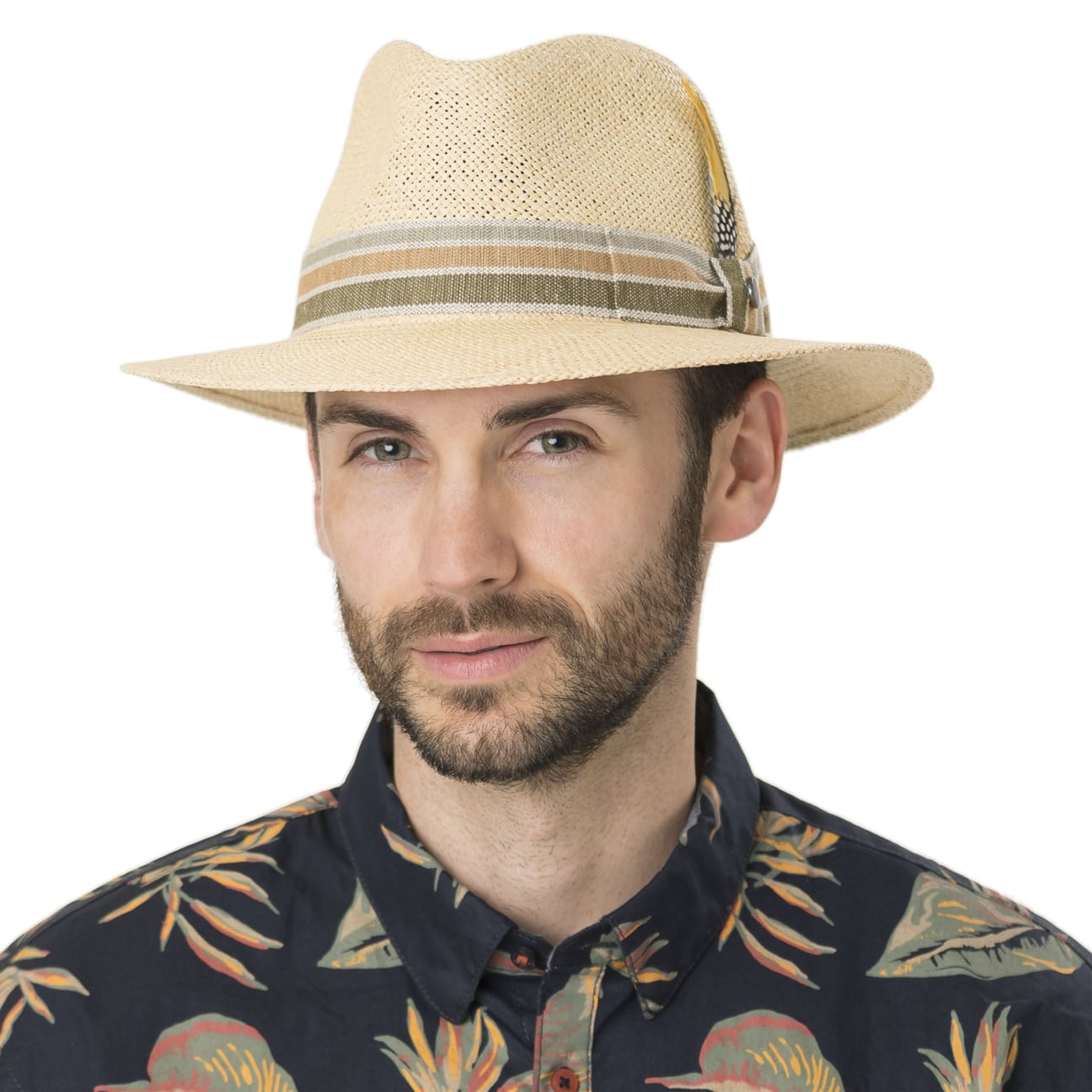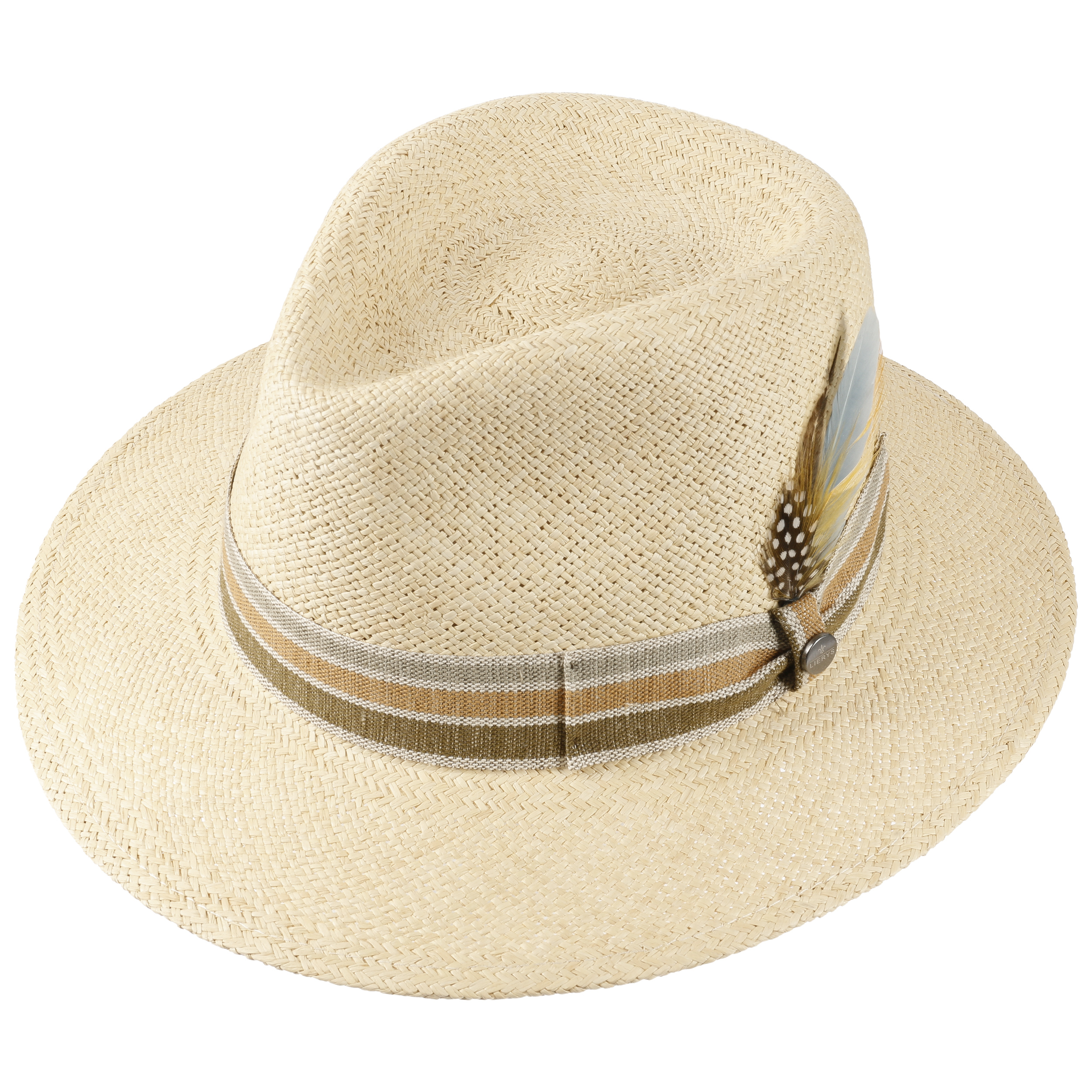 Straw hats, summer and sunshine belong together. Here, flexible, lightweight Panama straw has been made into a hat with a characteristically dented crown that proves to be a pleasant companion in sunny climes. A striped grosgrain ribbon trim in harmonious colours encircles the crown of this traveller hat and is adorned with fine feathers for an extra splash of colour.