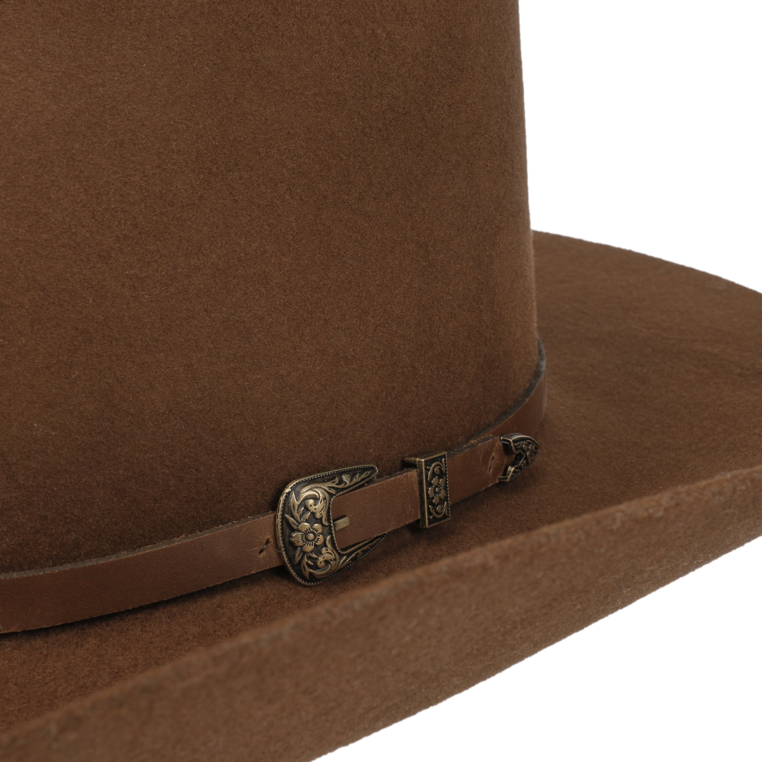 This Western hat from JJ Hats is striking and authentic. This elegant headgear in the typical cowboy design is made of high-quality wool felt and fine fur felt, which combines elegant chic with pleasant wearing comfort. A decorative leather trim strap with a metal buckle perfectly emphasises the stylish western touch. Ideal for autumn and winter, crafted with care in the USA.