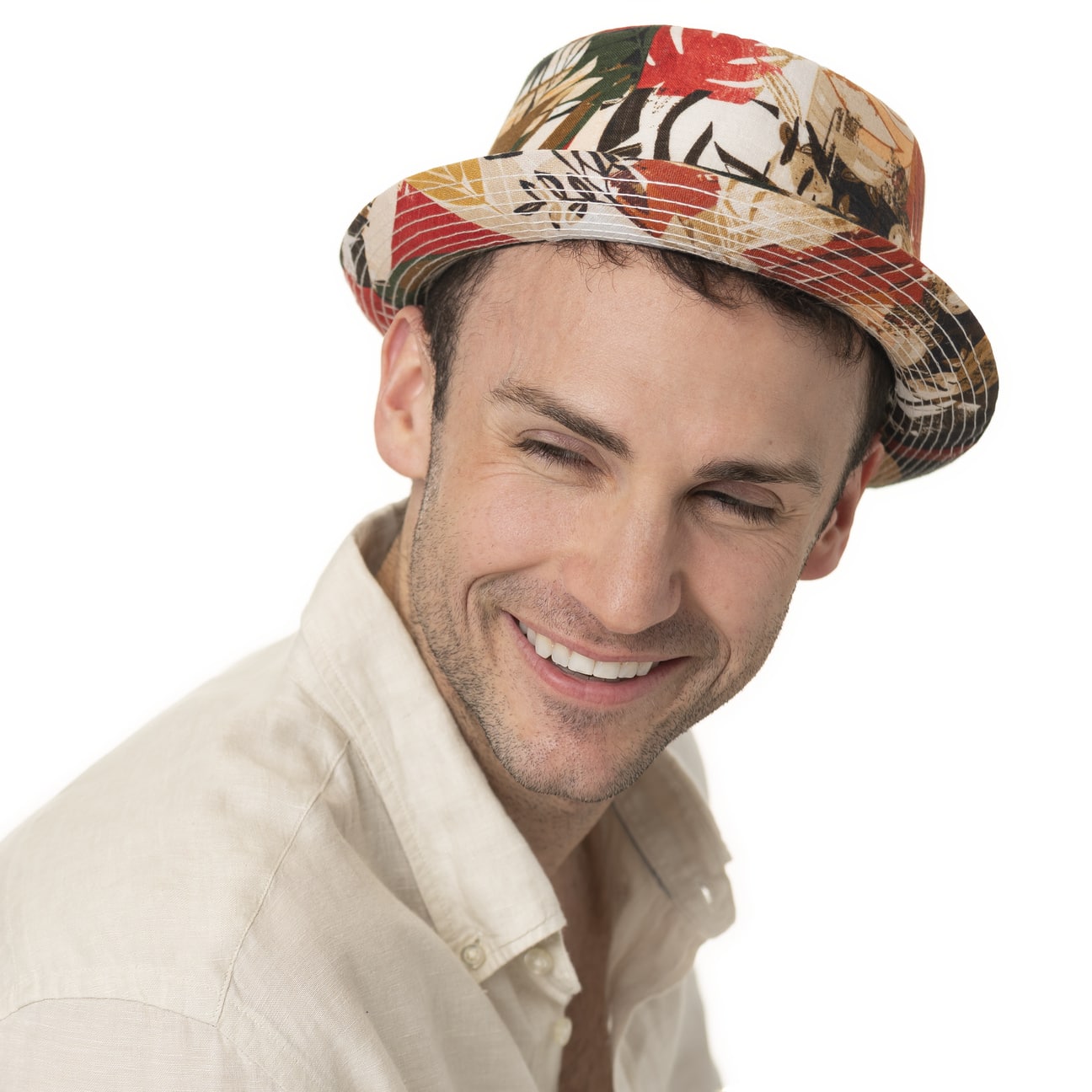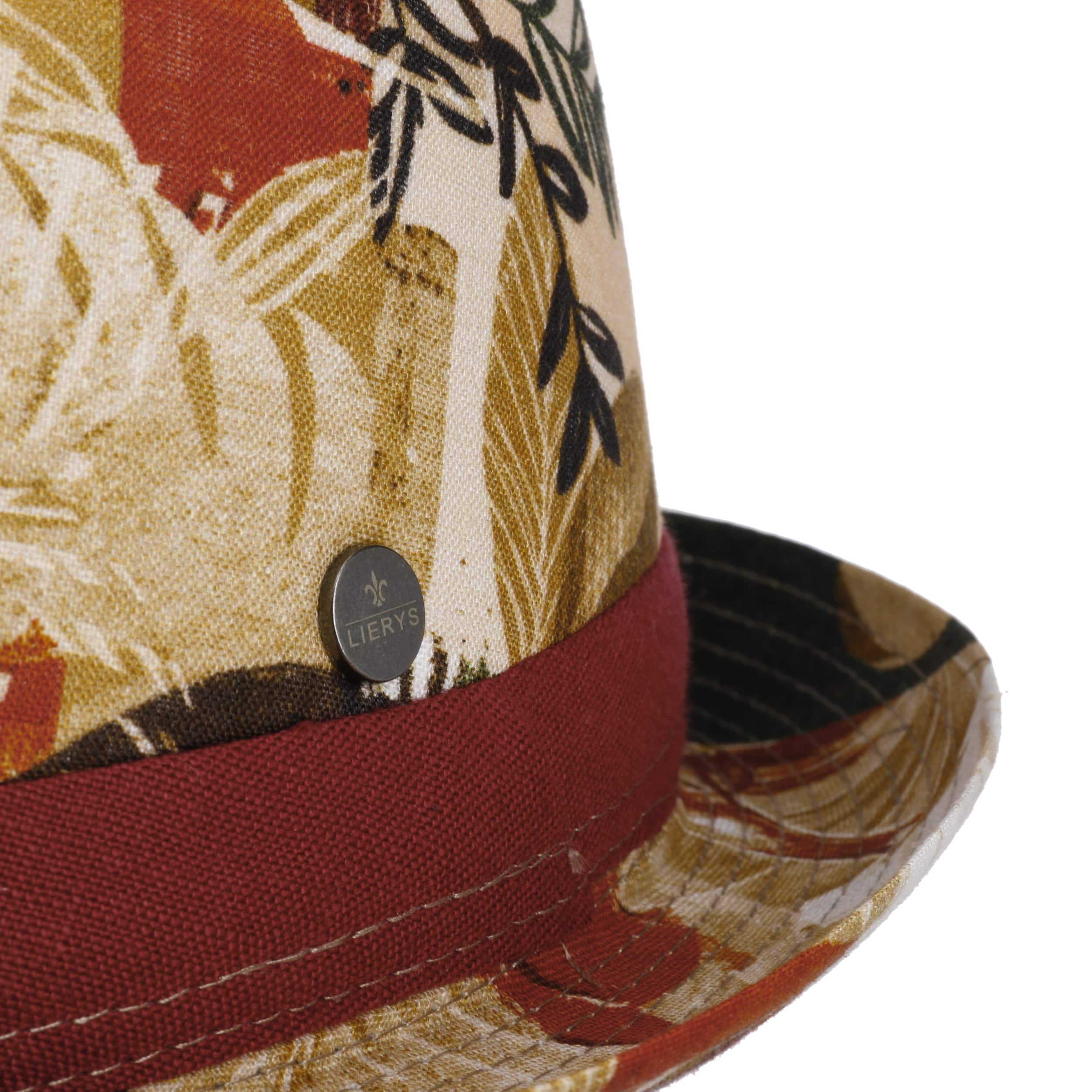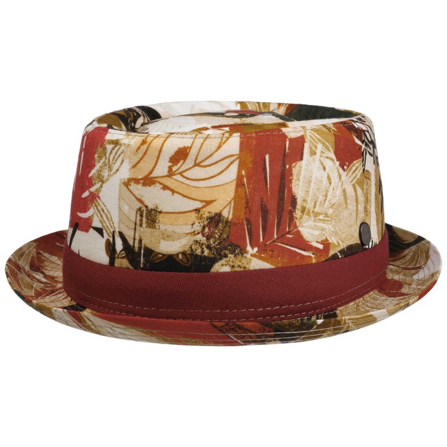 With its floral pattern in strong colours, the pork pie hat from Lierys attracts attention in European pedestrian zones. The wide grosgrain ribbon gives support and contour to the splendour of colours and shapes. 100% linen guarantees a cool and well-ventilated head. A skin-friendly lining with a high cotton content is incorporated on the inside.