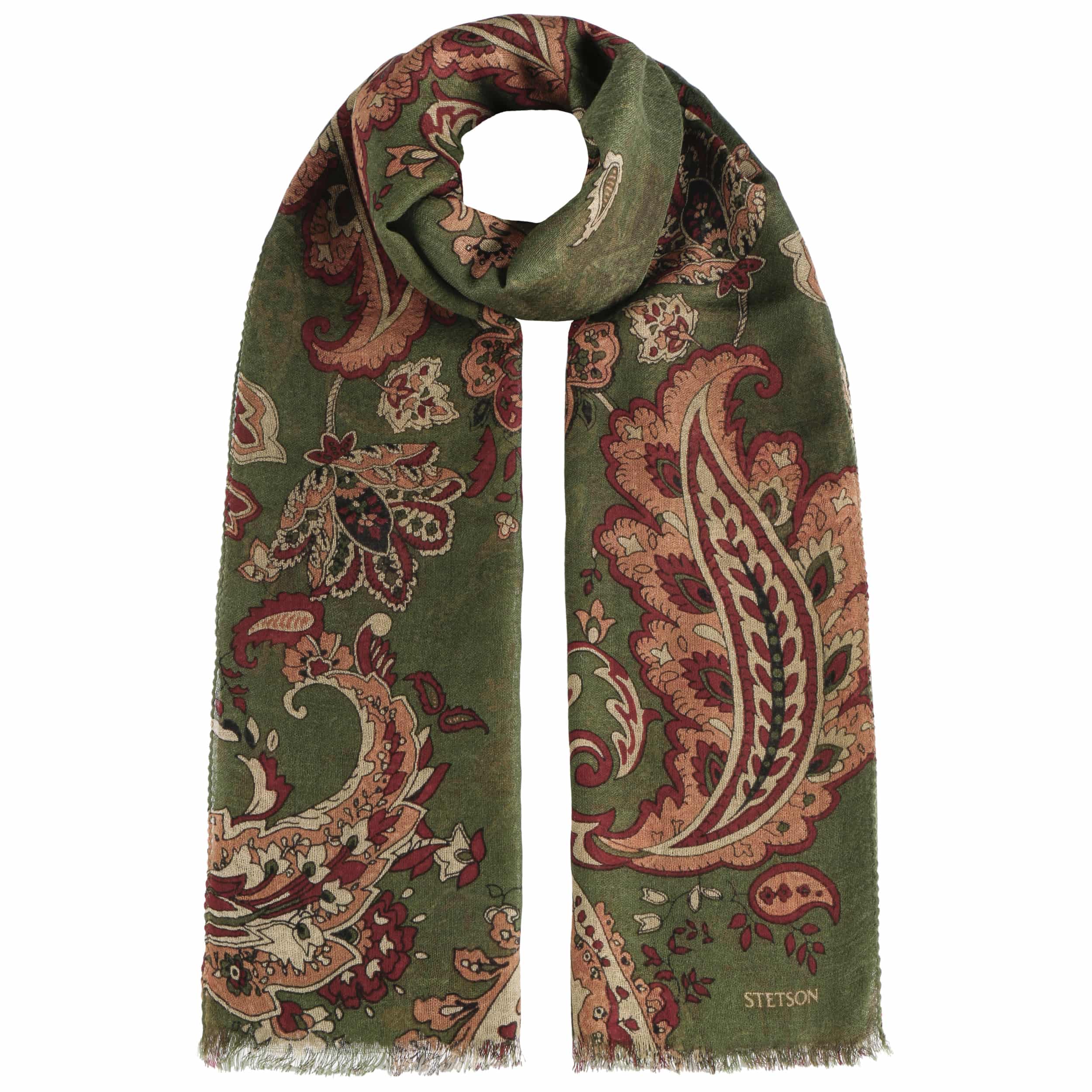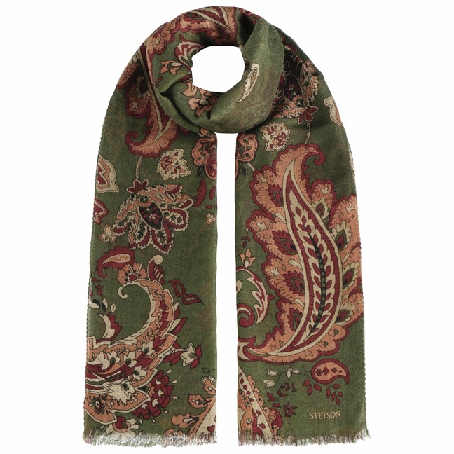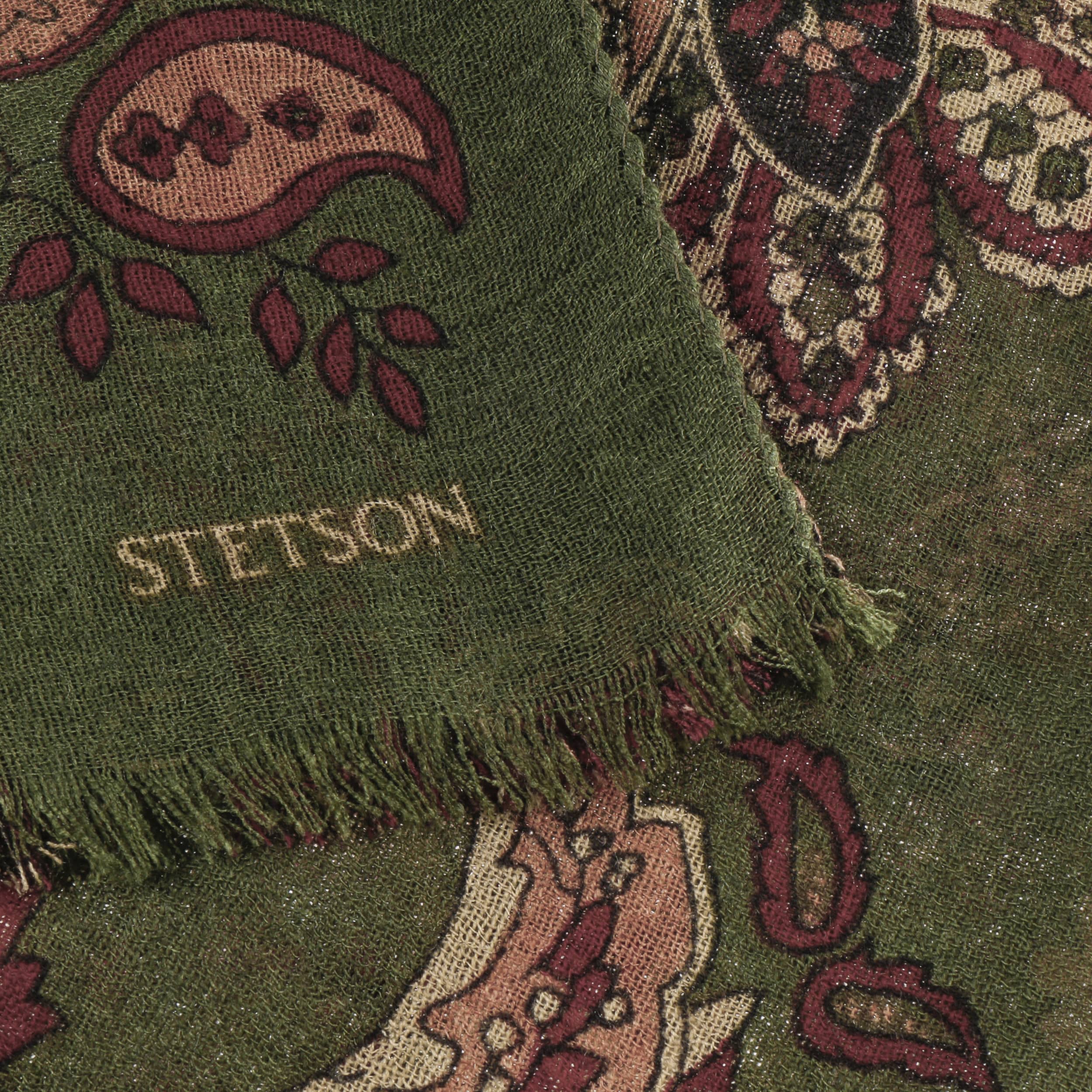 Since 1865, the name of John B. Stetson has been a synonym for best quality cowboy and Western hats. With the increasingly popular VitaFelt and VitaStraw collections, the U.S. brand has become pioneer of lightweight, water repellent and packable headwear. In the meantime, Stetson manufactures a wide range of first-class styles: army and baseball caps, flat hats, docker caps, beanies, trilbies and cowboy hats in many different designs.- Wool Paisley Summer Scarf by Stetson - dark green 1